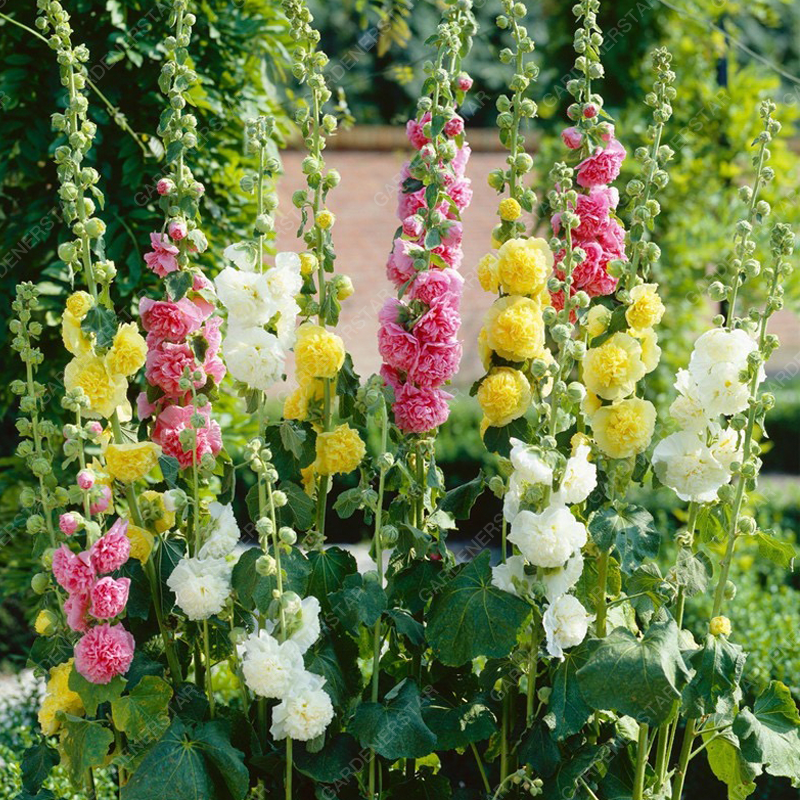 Hollyhock is a hardy biennial flowering plant that produces fully-double scarlet, pink, white, purple, brown and yellow flowers on sturdy spikes.