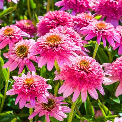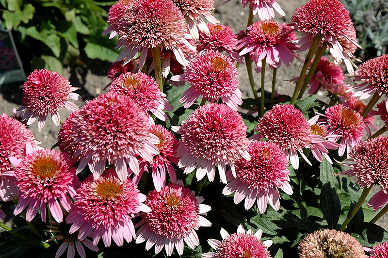 Noted for its compactness and sturdy habit, Echinacea purpurea 'Butterfly Kisses' is a particularly attractive double coneflower with large, fragrant, bright pink ray flowers, 3 in. across (7 cm), adorned with a darker pompom central cone. Well branched, its numerous flowering stems are strong and held upright. Blooming from midsummer until frost, this dwarf coneflower provides a vibrant floral display and is perfect for perennial borders, small gardens or patio containers. Can be used in fresh cut or dried arrangements.