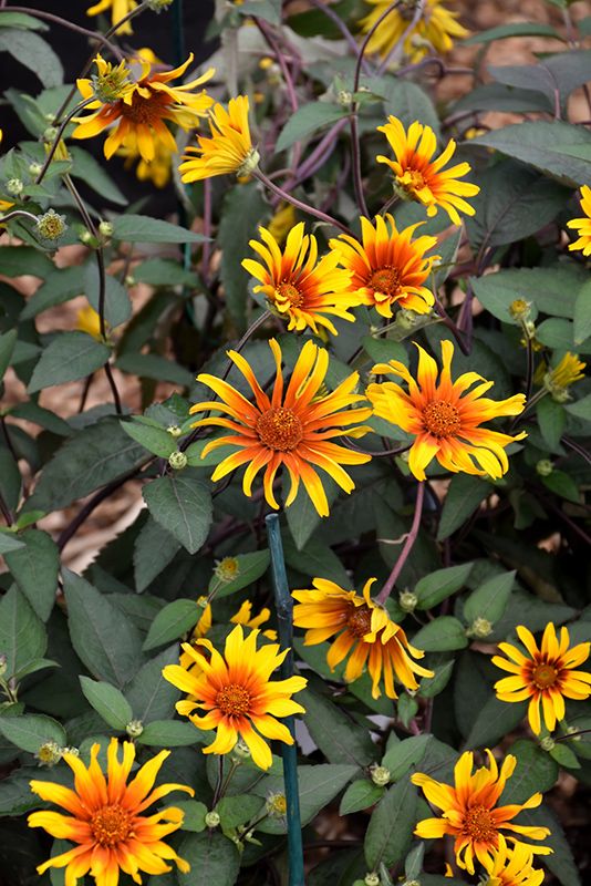 A real showstopper for late season borders or beds, this perennial favourite features daisylike blooms with vivid yellow petals surrounding a brilliant red-orange centre and brownish-yellow cone. The flowers are charming at 2–3" wide and contrast beautifully with the dark, purple-tinged foliage and stems. Pollinators like bees and butterflies are highly attracted to the bold hues. Plants tolerate drought well.