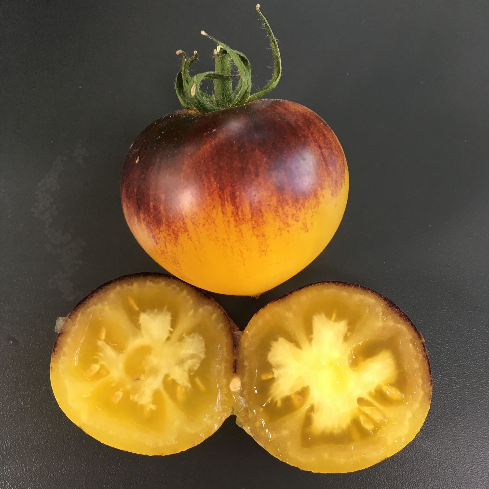 Belle Coeur (H34 Gelb) is a unique and eye-catching large cherry tomato that stands out in any garden. Slightly bigger than traditional cherry tomatoes, this stunning anthocyanin-rich variety showcases a striking contrast of deep jet-black on the top and vibrant canary yellow on the bottom. Each fruit develops its own individual shades of antho, making every harvest visually captivating. Adding to its charm, these tomatoes feature adorable little nipples at their base, which can be pure yellow or a blend of yellow and black.