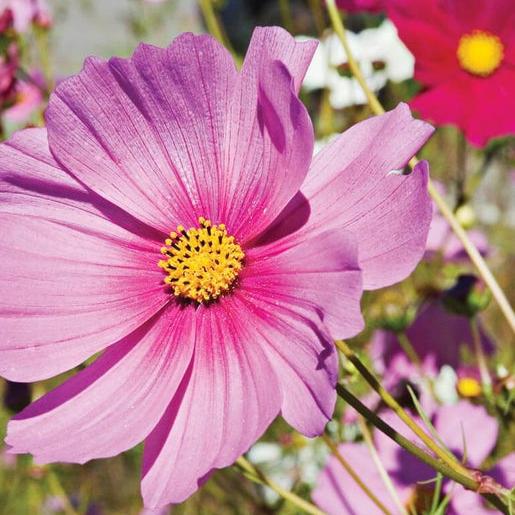 Cosmos bipinnatus. Reliable and well-loved single daisy shaped flowers with yellow centers bloom in white and various shades of pink. Pinching off the growing tip when the plant is about 15cm (6") tall will help keep this tall lacy plant bushy and erect. Do not overfeed, as rich soil will delay flowering. Sensation Mix cosmos seeds plant height 1.2-1.8m (4-6'). Stake these tall Cosmos in windy gardens, but in sheltered areas, this is not necessary. Deadhead (remove spent flowers) to extend the flowering period and keep plants looking their tidiest. Cosmos is quite drought tolerant so it makes a good candidate for xeriscaping. Provide some water in extreme drought. Sensation Mix won an AAS Award in 1936.